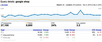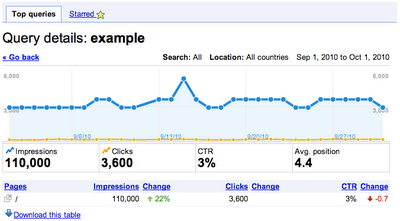 如果您点击列表上某一单个页面,您将会看到访问这一网页的查询流量列表,包括每次查询的网站印象和点击次数。