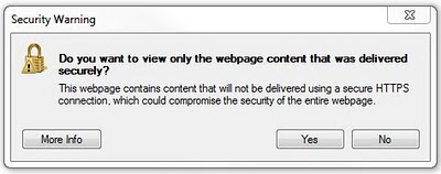很不幸,这意味着他们的安全结账页面,例如https://www.example.com/checkout/payment包含着不安全要素——也就是说该URL会调用“http://www.google-analytics.com/urchin.js”。Chrome和Firefox这样的浏览器不会显示警告,但Internet Explorer 8会在用户从不安全网页(http://)转向安全网页(https://)时提出如下安全警告。这个错误是这样的: