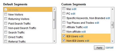 设置这些定制分类(custom segment)很容易,但为进一步提高便利性,我已经为您设置好了,您只需要点击这些链接,直接将这些类别添加至您的Google Analytics账户: