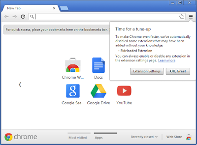 同时,所有此前通过外部插件选项安装的插件都将自动关闭。Chrome给用户发出提示,询问是否重新激活此类插件。