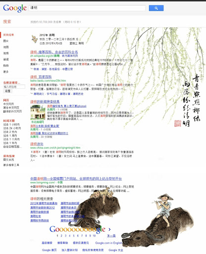 使用Chrome浏览器,在Google的搜索框内输入“清明”,结果页面是不是变得与以往不太一样呢?映入眼帘的是摇曳的柳枝,象征着春意昂然。“青青点点柳绿,雨落纷纷清明”, 页面会不时泛起层层涟漪,点击后还有一尾尾小鱼跃出水面,持续点击,还会出现不一样的惊喜!页面下方是两个牧童,骑在牛背上吹笛嬉戏,闲适而淡然