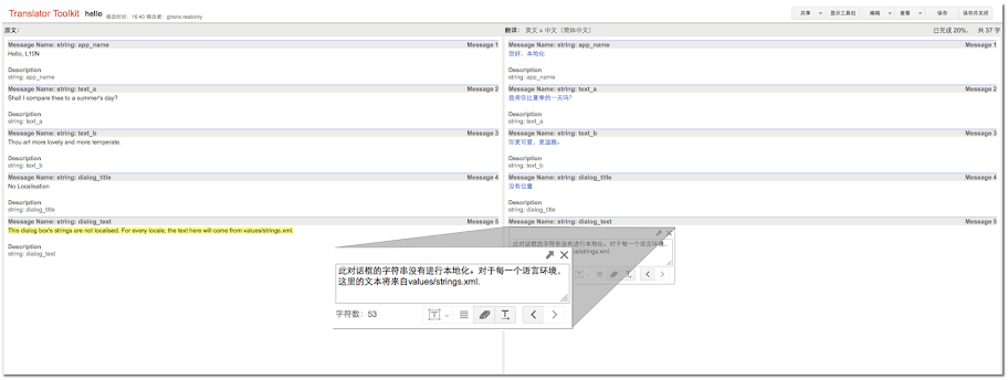 举个例子,当您需要翻译Android应用程序时,进入res/values目录,并将strings.xml上传到译者工具包 ,译者工具包会马上自动进行翻译。然后,您可以把文档
