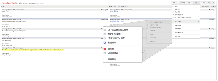 此外,我们还对译者工具包的应用界面做了相关调整,使用户可以更快、更准确地进行翻译。例如,通过“自定义颜色”,翻译员可以掌控翻译进程,通过显示“句中字符数”,来确保长度(这对于移动设备非常重要)。