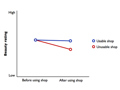结果表明,网站界面的美观程度并不影响用户对商店实用性的感知:无论产品外观如何,参与者(或者用户)都能够区分产品是否实用。然而实验表明,商店的实用性则会影响用户对其产品美观性的评级。使用商品后,购买了实用性差的商店商品的参与者对其产品美观性的评级较低。我们发现,实用性差会带来挫败感,使用户的心情变差,结果导致用户对商品的美观性的评级比与商店互动之前还要低。