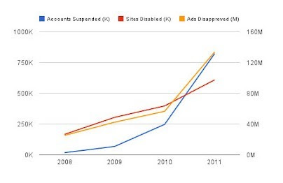 的广告,通常只要违规一次,我们便会禁止该广告主的账户。下面列出了一些数据,它展示了我们一段时间以来所取得的成绩,以及针对广告主账户、网站和广告所采取的多种措施,大家可以看到,这些数字在不断增加,而且增长速度越来越快。