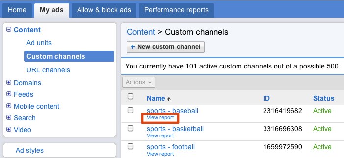 我们已经在“我的广告”标签下添加了对您报告的快速链接,您无需在报告中搜索广告单元或渠道。当需要查看“我的广告”标签上的广告单元、自定义渠道,或URL渠道时,您只需点击具体项目下的‘查看报告’,即可查看这一广告单元或渠道的效果数据。如果您正在查找的渠道数据未与该界面中的广告单元建立链接,该功能尤其有用,它可以帮助您节省时间。