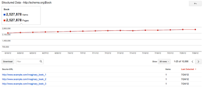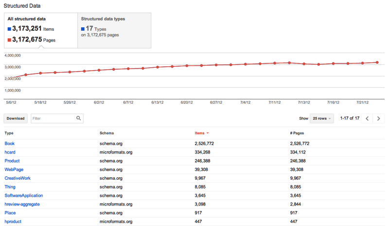 在这个最高级别上,位于“优化”项下的结构化数据仪表盘可以聚合这些数据(按照根项类型和词汇模式)。所谓根项类型,是指同页面上不属于另一数据项的某种属性的数据项。例如,下面的网站大约有200万个关于书籍(Books)的Schema.Org注释(“