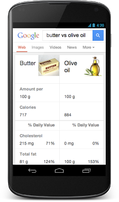 如果你想将两件事物进行对比,例如黄油与橄榄油中的饱和脂肪是怎样的呢?只需告诉Google “对比黄油与橄榄油”,那么新的对比工具为您提供新的见解,您可以列出自己的答案。