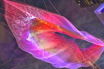 或其他现代移动浏览器打开网站,就可以参与互动。选择一种颜色之后,游客就可以用手指在设备表面滑动出轨迹,这些轨迹会即时投影到雕塑上,形成五颜六色的光束。最后,巨大的浮动画布上便会呈现出由大家共同创作的视觉画面。