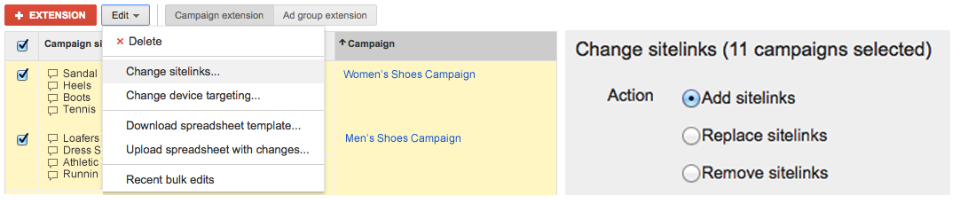 例如,如果您想在原有附加链接上新增一个季节性促销活动,首先您可以先选择相应的广告系列,然后点击编辑菜单中的“更改附加链接”(Change sitelinks)进行更改(参见下图“批量更改附加信息”)
