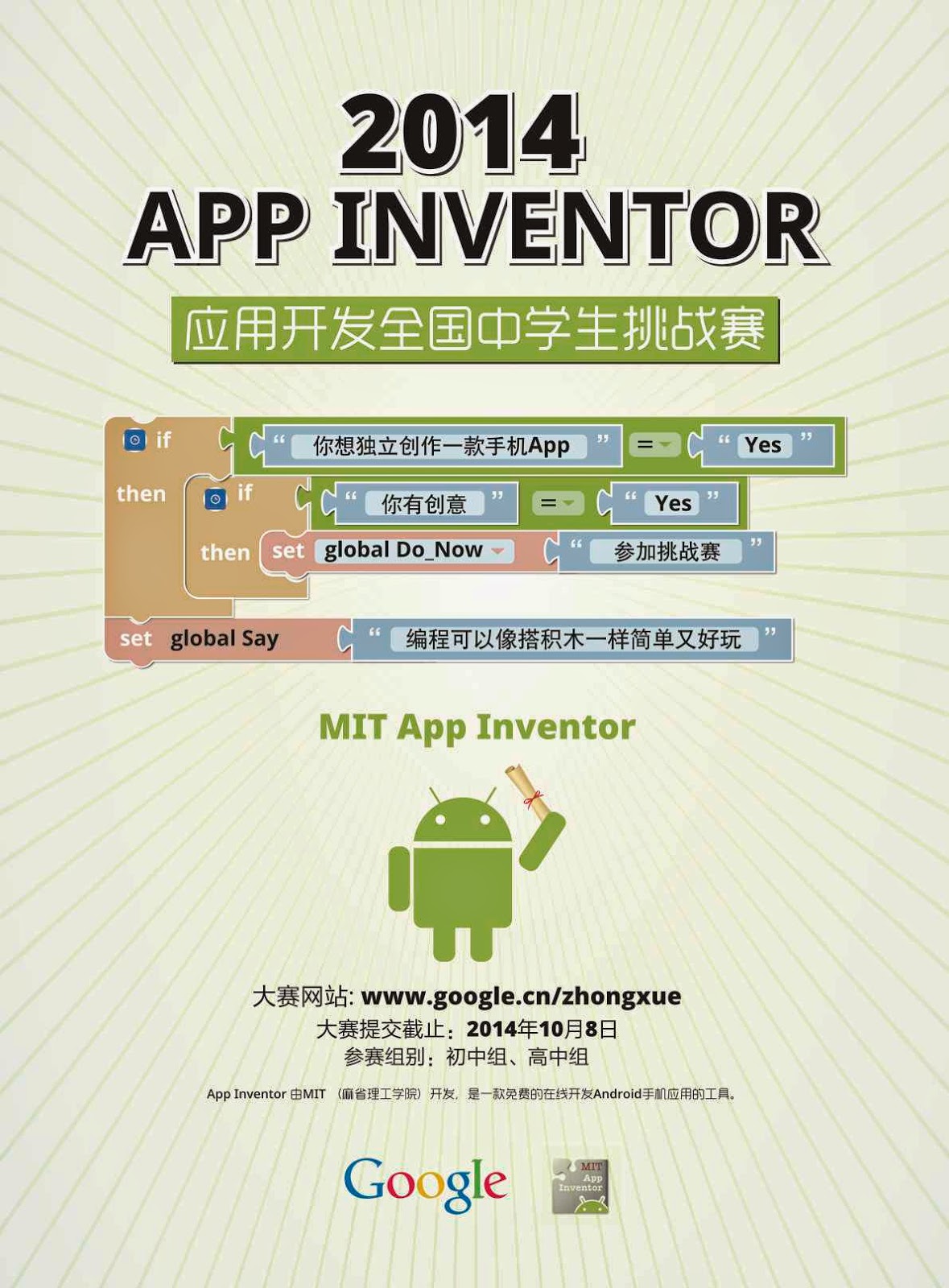 正在接受报名,我们欢迎更多的在校中学生踊跃报名参加,在 App Inventor 平台上锻炼计算思维,将创新的点子真正落到实践中来。了解更多信息,请访问大赛主页