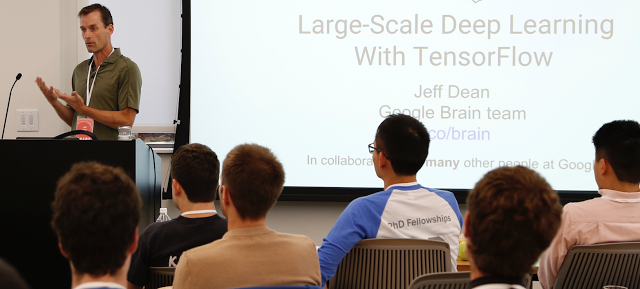 图为 Google 高级研究员 Jeff Dean 分享 TensorFlow 在 Google 的使用