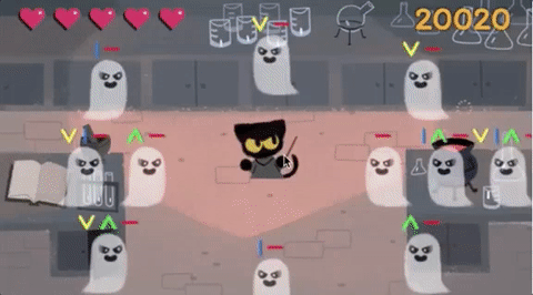 战胜幽灵,最终拯救魔法学院。血量变低也不要怕,当头顶爱心符号的小猫幽灵出现时,只要用鼠标画爱心便可回血哦!
