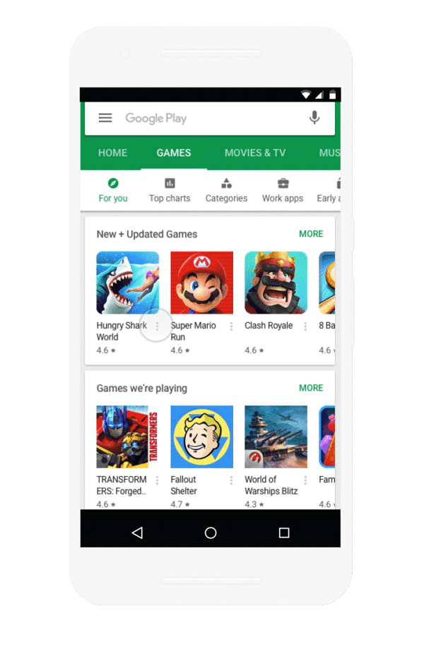 测试版——这是一种通过视觉、声音和动作吸引 Google Play 玩家的新方式。 在这些广告位中,用户能够通过点按、滑动或滚动浏览开发者展示的游戏产品,寻找自己喜欢的程序,帮助开发者获取用户。